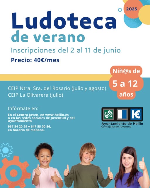 El Ayuntamiento de Hellín, a través de la concejalía de Juventud, pone en marcha un año más la Ludoteca de Verano, una iniciativa muy demandada por las familias que busca favorecer la conciliación laboral y familiar durante el periodo estival. El programa se desarrollará durante los meses de julio (del 2 al 31) y agosto (del 1 al 28), con un total de 75 plazas disponibles por mes, destinadas a niños y niñas nacidos entre 2013 y 2020, matriculados en centros educativos de Hellín y sus pedanías.
